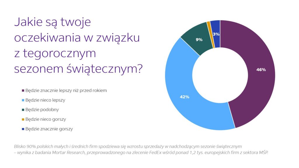 Blisko 90% polskich małych i średnich firm spodziewa się wzrostu sprzedaży w nadchodzącym sezonie świątecznym – wynika z badania Mortar Research na zlecenie FedEx przeprowadzonego wśród ponad 1,2 tys. europejskich firm z sektora MŚP.