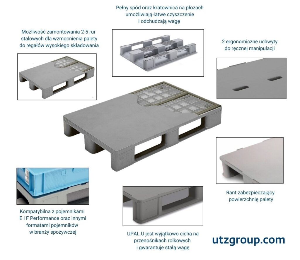 Palety plastikowe Utz charakteryzują się stałą masą własną, odpornością na wilgoć, chemikalia i uszkodzenia mechaniczne. Są łatwe w czyszczeniu, co ma kluczowe znaczenie w branżach wymagających wysokiej higieny. Model UPAL-U wykonany jest z wysokiej jakości tworzywa UIC® (regranulat), co zapewnia odporność na wilgoć, chemikalia i zmienne warunki temperaturowe. Nośność statyczna palety wynosi do 5000 kg, a dynamiczna do 1500 kg, co pozwala na bezpieczne składowanie i transport ciężkich ładunków. Konstrukcja jest zoptymalizowana pod kątem automatyzacji – gładkie powierzchnie i precyzyjne wymiary (1200 × 800 mm) gwarantują kompatybilność z systemami przenośników i robotami paletyzującymi. Paleta jest w pełni higieniczna, łatwa do mycia i nie generuje odłamków, co eliminuje ryzyko zanieczyszczeń w procesach produkcyjnych.