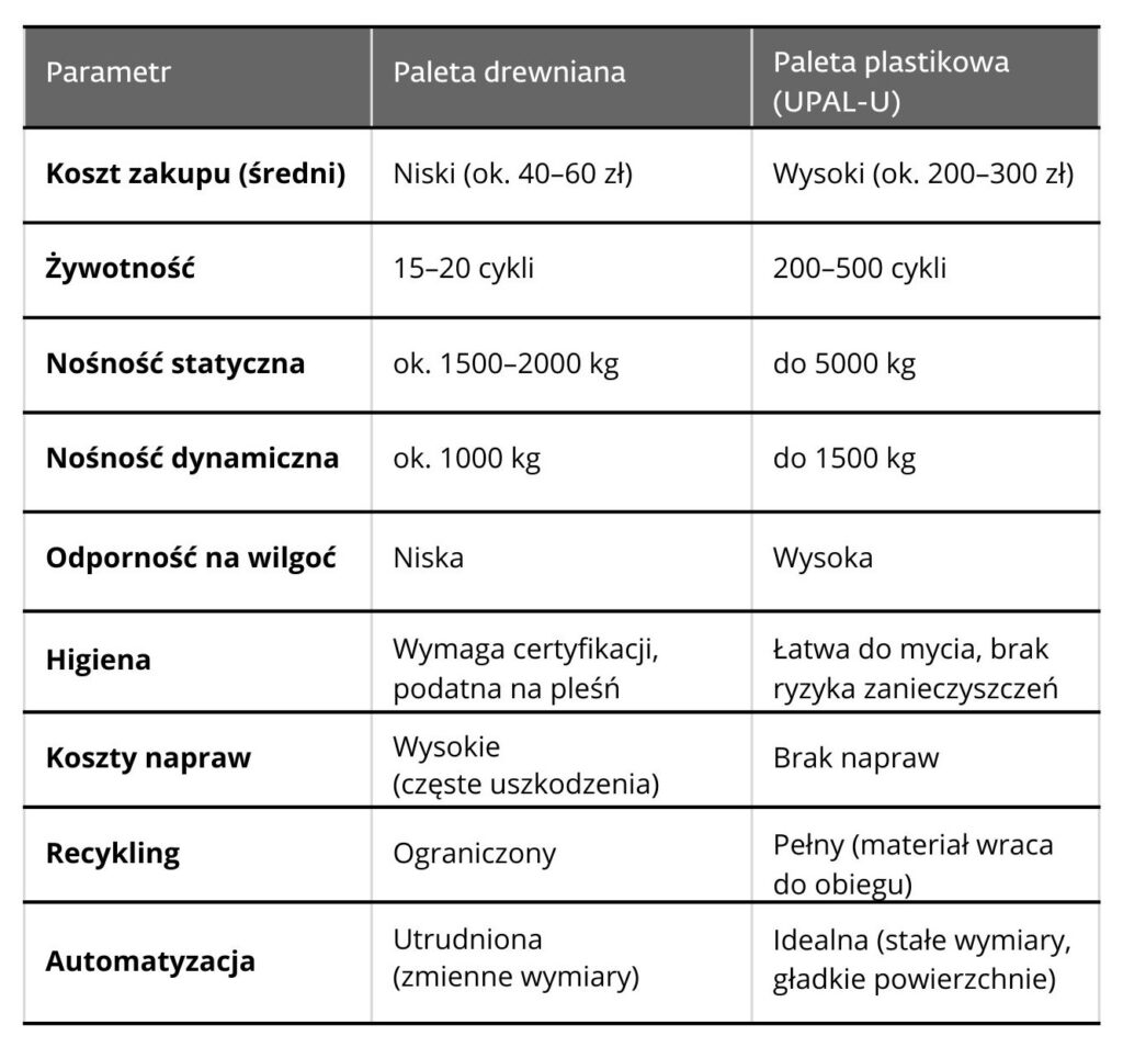 Choć cena zakupu jest wyższa, palety plastikowe mają kilkukrotnie dłuższą żywotność niż drewniane. W obiegu zamkniętym minimalizuje się ryzyko utraty i uszkodzeń, co redukuje koszty napraw i wymiany. Stała tara ułatwia kontrolę w systemach automatycznych, a brak nasiąkania eliminuje problemy z higieną. Po zakończeniu cyklu życia palety Utz są poddawane recyklingowi, co zamyka obieg materiałowy i zmniejsza emisję CO₂. Analizy TCO pokazują, że mimo wyższego kosztu początkowego, całkowite koszty w okresie 5–7 lat są niższe niż w przypadku palet drewnianych, głównie dzięki redukcji strat i kosztów serwisowych.