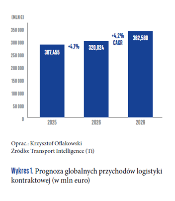 Najnowsza analiza Ti wskazuje, że 2026 r. ma przynieść wzrost wartości rynku kontraktowego na poziomie ok. 4,1% do ok. 320 mld euro. W dłuższej perspektywie, tj. do 2029 r., globalny rynek osiągnie przychody sięgające 362,6 mld euro, co oznacza średnioroczny wzrost w latach 2025–2029 na poziomie 4,2% (CAGR). Będzie to utrzymanie jednocyfrowego trendu wzrostowego wspieranego przez outsourcing usług, rekonfigurację światowych sieci logistycznych i zaopatrzeniowych oraz inwestycje w technologie wspierające procesy logistyczne.