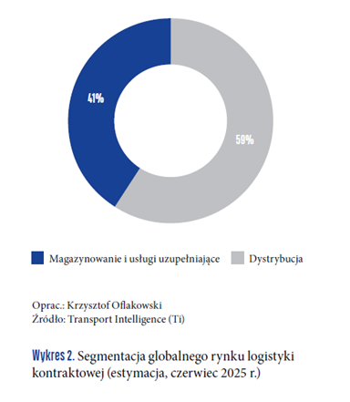 W całym 2025 r. niewiele zmienił się również rozkład przychodów w poszczególnych segmentach rynku kontraktowego. Największy udział, przekraczający połowę wartości sektora, należał do dystrybucji (59%), a w czerwcu 2025 r. jego wzrost szacowano na 3,5% rdr. Nieco niżej pod względem tempa wzrostu uplasowało się magazynowanie (3,2%) oraz usługi o wartości dodanej (2,5%).