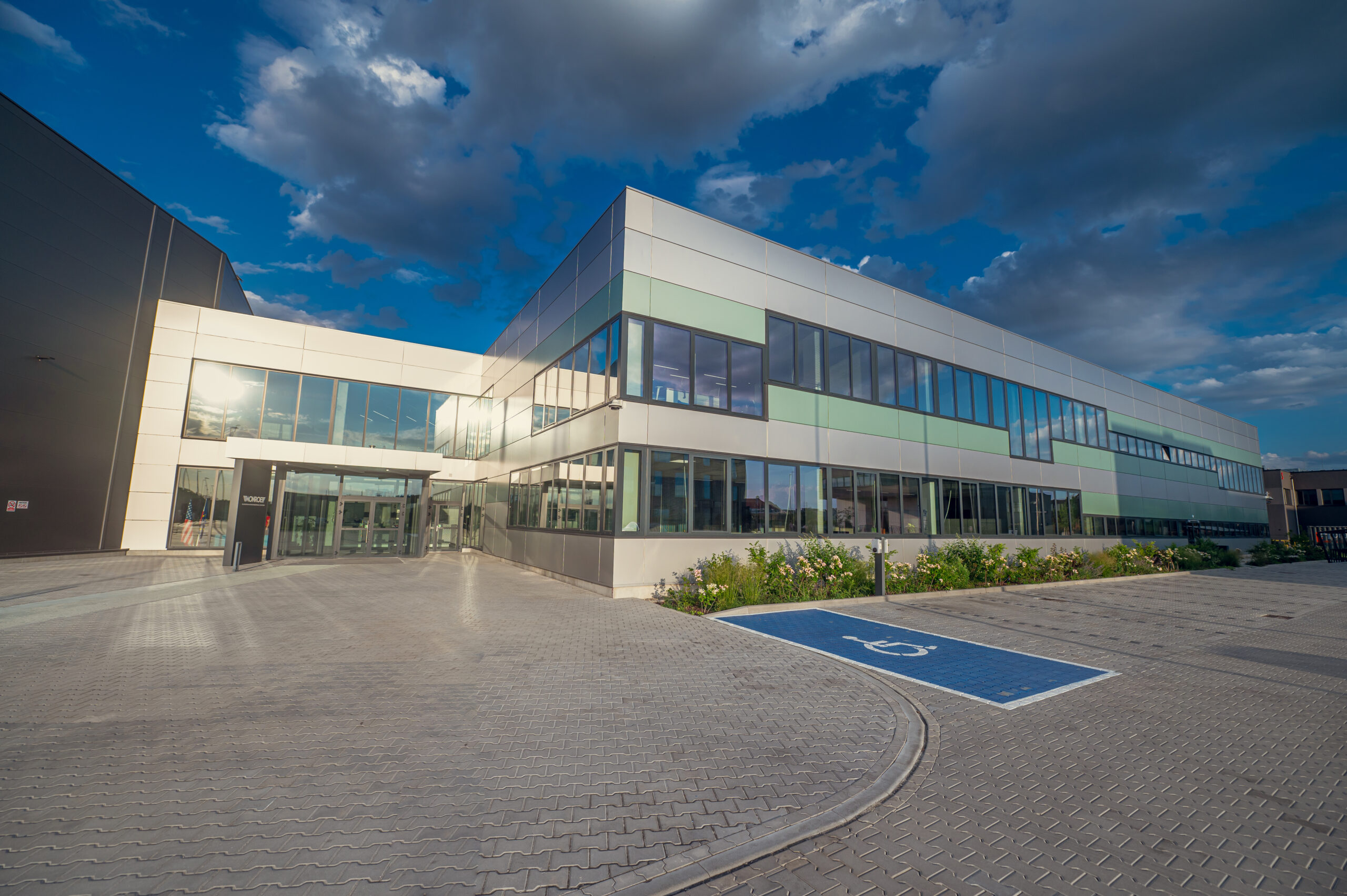 Hala magazynowo-produkcyjna została wyposażona w klimatyzację ewaporacyjną, która jest oszczędna energetycznie i zapewnia odpowiednią wilgotność powietrza. W biurowcu wdrożono nowoczesny system rekuperacji oraz wysokowydajne pompy ciepła, odpowiadające za efektywne ogrzewanie i chłodzenie pomieszczeń. Oświetlenie w całym obiekcie – zarówno w hali, jak i w biurach – wykonano w technologii LED i podłączono do inteligentnego systemu sterowania, który dopasowuje natężenie światła do warunków i potrzeb użytkowników. Hala produkcyjna została zaprojektowana z dużą liczbą świetlików dachowych, co maksymalizuje dostęp światła dziennego, ograniczając zużycie energii elektrycznej. Dodatkowo na terenie działki ustawiono domki dla owadów, co stanowi element kompensacji środowiskowej, wspierając lokalną bioróżnorodność i równowagę ekosystemu.