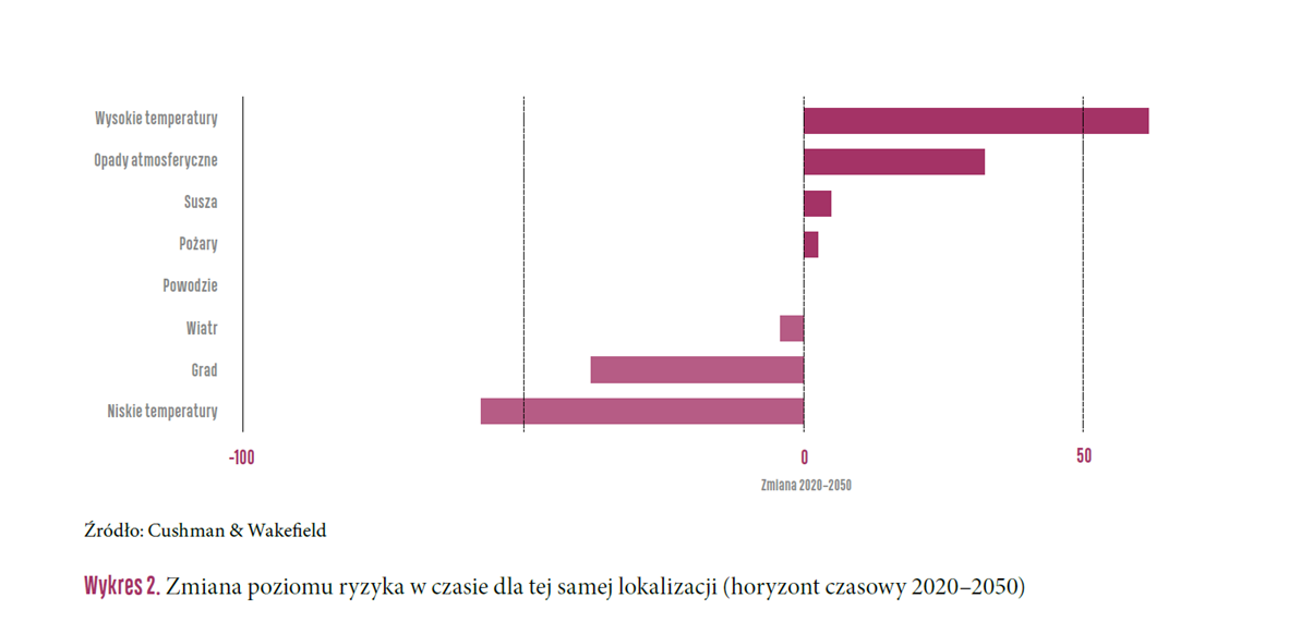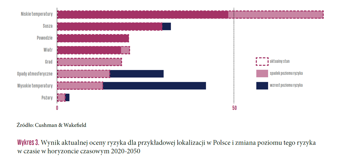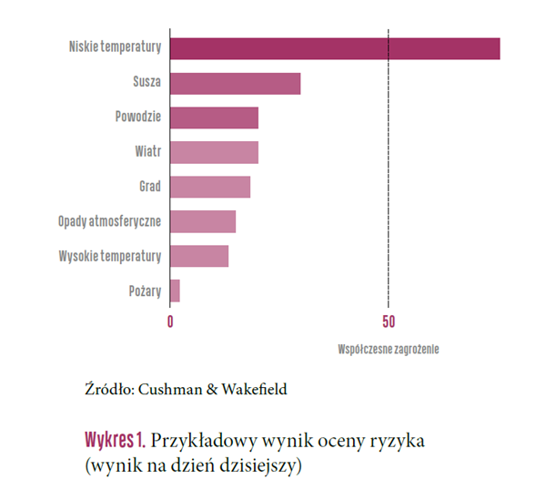 Z analiz przeprowadzonych przez Cushman & Wakefield w wybranych lokalizacjach w Polsce wynika, że do najczęściej występujących w kraju ryzyk należą: wysokie temperatury i fale upałów, intensywne opady deszczu, a także – choć mające trend spadkowy – niskie temperatury. W skali lokalnej szczególnie często znaczenie mają natomiast silne wiatry, powodzie, osuwiska oraz – w przypadku regionów nadmorskich – podnoszenie się poziomu morza i erozja obszarów przybrzeżnych.