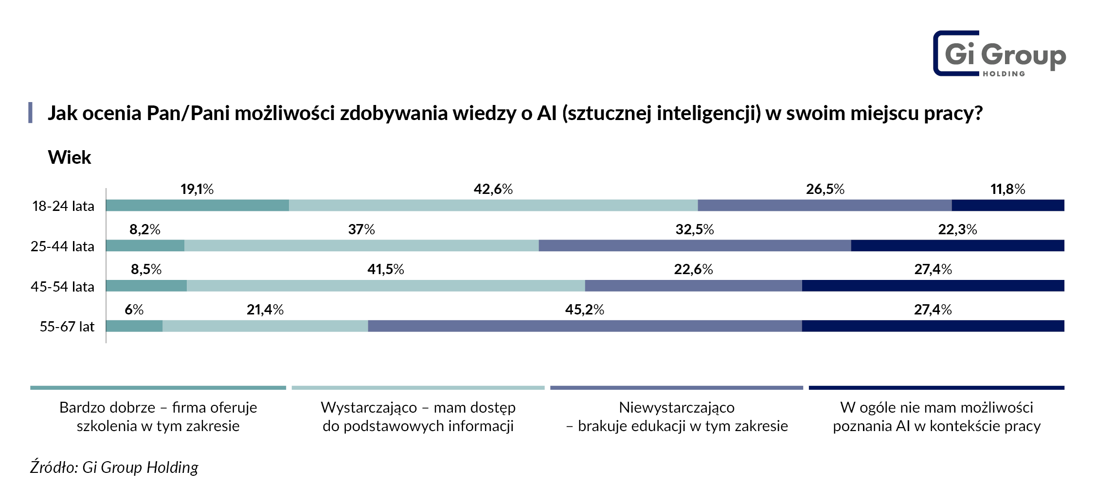 Ubiegłoroczny „Barometr rynku pracy” Gi Group Holding dowodzi, że w kwestii edukacji pracodawcy mają jeszcze wiele do zrobienia. Wśród najstarszych pracowników tylko 6% bardzo dobrze ocenia ofertę szkoleniową swoich firm, która pozwala im dokształcać się na temat AI. Niewystarczający poziom lub brak możliwości zdobywania wiedzy na temat tej technologii zadeklarowało łącznie 72,6%.